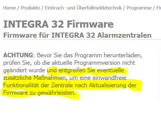 Ist es prinzipiell möglich, die Firmware v1.07 (meine aktuelle Firmware) durch v.1.18 zu ersetzen? Wenn ja, worauf muss/soll man achten, dass es zu keinen Problemen bis zum Ausfall der Anlage kommt. Satel selbst schreibt: "INTEGRA 32 Firmware Firmware für INTEGRA 32 Alarmzentralen ACHTUNG: Bevor Sie das Programm herunterladen, prüfen Sie, ob die aktuelle Programmversion nicht geändert wurde und entgreifen Sie eventuelle zusätzliche Maßnahmen, um eine einwandfreie Funktionalität der Zentrale nach Aktualisierung der Firmware zu gewährleisten." LG georg [attachment=3051] |