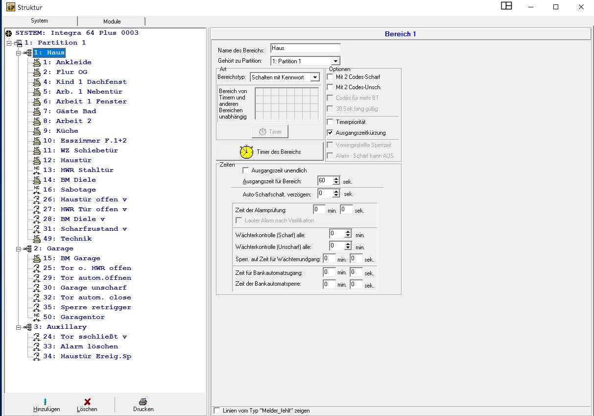 A) und B) kannst du in einem Bereich (Zone) zusammenfassen und den Bewegungsmelder als Reaktionstyp 3 "interne mit Verzögerung" konfigurieren. Bei intern scharf ist der dann gesperrt und bei extern scharf kannst du die Auslösung verzögern, falls du selber durch den überwachten Bereich musst um unscharf zu schalten oder um das Haus zu verlassen. Die Garage bekommt nur einen separaten Bereich (in der gleichen Partition). Du kannst in den Bedienteileinstellungen festlegen, welche Bereiche sie scharf/unscharf schalten sollen/dürfen. Das Öffnen der Garage sollte bzw. muss nicht zur Entschärfung der Alarmanlage führen. Du kannst den Bereich Garage auch einfach sperren, oder nur die Linie, die in der Garage auslösen würde, wenn du rein kommst (z.B. Bewegungsmelder). Ich habe genau die gleiche Konstellation wie du. Doppelgarage mit Nebeneingangstür zum Haus. Über einen Kontakt im Torantrieb sperre ich den BM in der Garage (wenn die Garage per FB geöffnet wird), die Anlage bleibt aber scharf. Die Nebeneingangstür ist als Ein-Ausgangstür mit Verzögerung projektiert. Bedienteil sitzt im Haus. Wenn ich die Garage verlasse (extern scharf), ist die Torschlussmeldung der Trigger, den Bereich scharf zu schalten. Bei "intern scharf" sofort. Hierbei wird geprüft, ob das Tor auch geschlossen ist, wenn nicht, wird es automatisch geschlossen und danach die Garage scharf geschaltet. Satel Integra 64 Plus, alles diskret verdrahtet, kein Funk, 2xINT-TSI, 2xSatel Grey Dual, 6xVD-1, 8xS1, 1xB-3A, INT-VG, ETHM1-Plus, INT-GSM LTE, 2xSPW100, SP-4003. In Betrieb seit 02.01.2016.