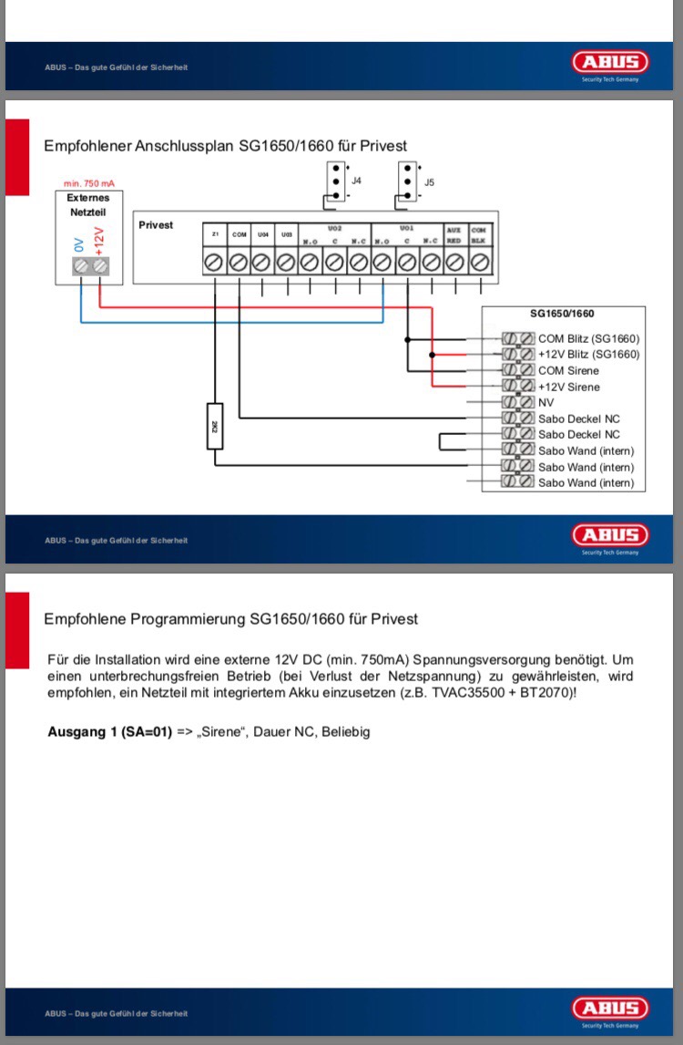 Ich möchte den Kombisignalgeber ABUS SG 1650 an eine ABUS Priest anschließen und benötige Hilfe bei der Verdrahtung bzw. Programmierung. Ein externes Netzteil für den SG 1650 ist vorhanden. Besonders wichtig ist mir, dass Sirene und Blitz die Aktivierung bzw. Deaktivierung der Alarmanlage quittieren. Die Verdrahtung habe ich vorgenommen, wie Abus es im Internet vorschlägt. (Siehe Anlage) +12V Netzteil an +12V Blitz und Sirene 0V Netzteil an VO1 N.O der Privest COM Blitz und COM Sirene an VO1 C der Privest Die aktuelle Programmierung lautet: 3 Ausgänge -> 1 Definieren: SA=01 SA:01 folgt: 1) System 01) Sirene Konfiguration. SA=01: 4) Dauer N/C Das Ergebnis ist, dass Blitz und Sirene dauerhaft an sind. Was mache ich falsch? Bitte helft mir. Vielen Dank! Mit freundlichen Grüßen von stabilo |