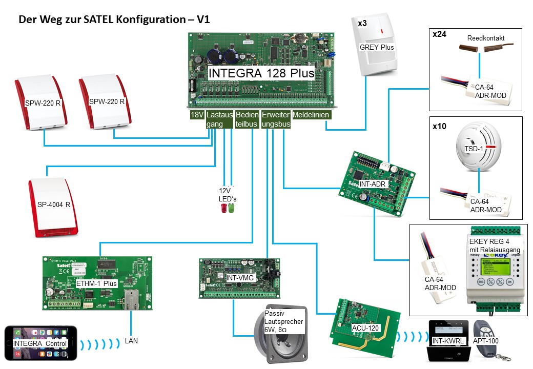 ich habe eine Frage zu einer Integra 128 Plus. Die Frage ist ob ich Melder (Reedkontakte von Fenster über CA-64 ADR-MOD & Busbewegungsmelder) und Signalgeber wie Sirenen oder Leuchten und Bedienteile alle an EINEM Buskabel anschließen kann oder ob ich da bestimmte Komponenten separat zur Integra verkabeln muss. Gibt es überhaupt Bus-Signalgeber von Satel die ich einbinden kann oder brauche ich da eine separate Leitung? Braucht ein Bedienteil ein anderen Anschluss? Geht mir erstmal um die nötige Verkabelung die ich einplanen muss. Vielen Dank für Hilfe Jens |