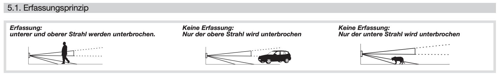 (26-12-2019 12:32)hagueklo schrieb: 1. lässt es sich einrichten, dass bei Detektion durch den Außenmelder eine Sprachnachricht ausgegeben wird und erst nachdem der potentielle Einbrecher weitergeht und ein Fenster öffnet, der Alarm losgeht? Na klar ... genau das ist einer der Stärken des D22 Systems. Bevor das System einen Vollalarm auslöst, kann man zwischen drei verschiedenen Arten von "Voralarmen" wählen ... immer mit unterschiedlichen Reaktionen 8gedämpfter Alarm, Blitzleuchte, Piepsen, Sprachansage, Hundegebell usw.) ... alles eine Frage der Programmierung. Sprachansagen kannst Du grundsätzlich über die Aussensirene SH425AX ausgeben lassen. Alternativ hat der Melder SH156AX ebenfalls ein Sprachmodul welches aber nur dann anschlägt, wenn dieser Melder auslöst. (26-12-2019 12:32)hagueklo schrieb: 2. in den Außenbewegungsmeldern sind zwei IR-Keulen (tierimmun) verbaut, wovon sich nur eine Keule verstellen lässt ... Wie lässt sich die Tierimmunität besser einstellen, sodass die 2 Katzen (oder andere kleinere Tiere) den Alarm nicht auslösen? Die beiden IR-Sensoren an sich haben keine Tierimmunität - das wird nur erreicht, indem der Melder erst auslöst, wenn beide Elemente zeitgleich ansprechen. Um also Deine Frage zu beantworten: hängt sich eine Katze senkrecht vor den Melder, löst dieser aus ... genau so wenn sich zwei Katzen gleichzeitig in je einem Sichtbereich des Melders aufhalten. Im Anhang mal ein allgemeines Bild von den Erfassungsbereichen. (26-12-2019 12:32)hagueklo schrieb: 3. Wie gut ist die Auflösung eines Außen-Bewegungsmelder mit Kamera (DTSH156AX)? Lässt sich bei der vorhandenen VGA-Auflösung sicher erkennen, ob ein Tier oder ein Mensch den Alarm dort ausgelöst hat (bei Tag und bei Nacht)? Hat das Dein Errichter nicht getestet? Normalerweise bekommst Du die Videos doch mit der App direkt auf's Handy ... Am Tage reicht die Qualität absolut aus um zu erkennen was da rumläuft - nachts kommt es auf die Umgebungsbeleuchtung an, die eigenen IR LEDs reichen leider nicht besonders weit. (26-12-2019 12:32)hagueklo schrieb: 4. Lässt sich diese Anlage auch an eine bestehende Hager-KNX-Anlage (SmartHome) anbinden? Irgendwie "verbinden" kann man das bestimmt ... aber was genau versprichst Du Dir davon?(26-12-2019 12:32)hagueklo schrieb: Wäre schön, wenn mir jemand von Euch weiterhelfen könnte, da die Kommunikation mit meinem Errichter und Daitem sehr zeitaufwändig und nicht immer hilfreich und zielführend ist. Das ist leider schade - eventuell helfen da mal ein paar klare Worte oder ein Anruf beim Daitem Aussendienst ... |