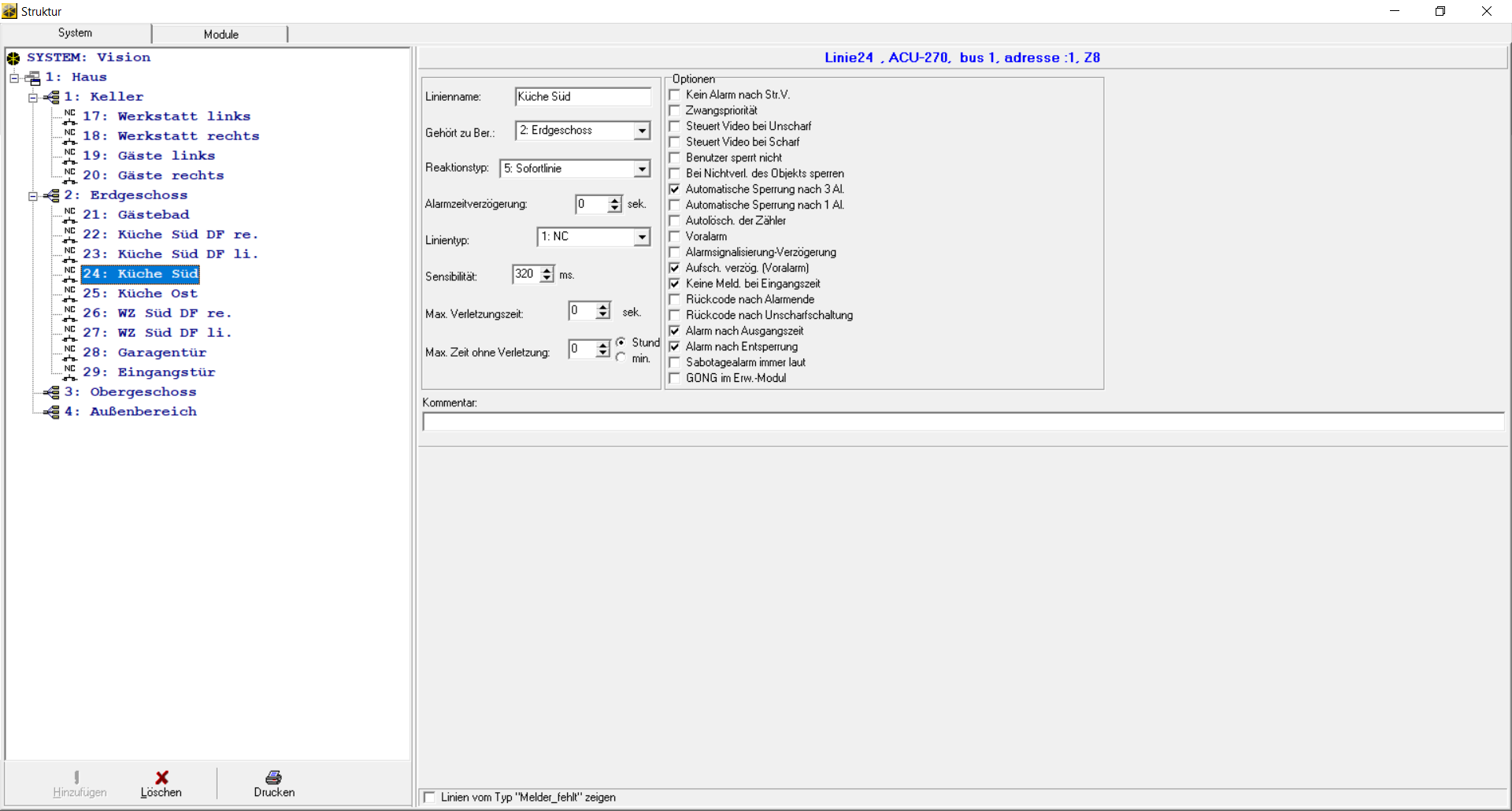 inzwischen ist der Keller und das EG soweit fertig installiert: - Türen und Fenster haben jeweils einen AXD-200 - Integra 64 mit ACU-220 läuft, inkl. KWRL-2 via ABAX2 Eingangszeit weckt das Display auf und zählt die 45s runter. Ausgangszeit musste auf die gesamte Partition (Erdgeschoss) gesetzt werden, da sonst das Bedienteil keinen Timer für die verbleibende Zeit angezeigt hat (die Punkte "Eingangszeit signalisieren" und "Ausgangszeit signalisieren" konnten nicht angewählt werden, da deaktiviert, wie auf den Screenshots ersichtlich). Das ist sicher nicht optimal aber funktioniert erst mal. Soweit, sogut. Nun hätte ich gern einen Teilscharfmodus bei Anwesenheit, wo das Bedienteil erst eine Weile alarmiert bevor die Sirene losgeht, falls ein Unvorsichtiger doch mal das Fenster öffnet ohne daran zu denken, dass es überwacht ist. Ich hatte es schon mit "intern mit Verzögerung" probiert (wie im Erfahrungsbericht hier im Forum), da hat das Bedienteil aber nicht alarmiert. Habt ihr eine Idee? Screenshots der Konfiguration habe ich mal angehängt. Viele Grüße nabonid |