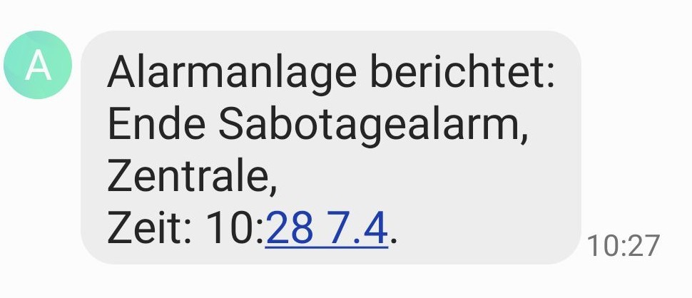 schönen Vormittag ans Forum Bedingt durch schwache Batterien, die sozusagen "langsam sterben" hatten wir immer wieder das Problem, daß dadurch nahezu pausenlos SMS gesendet werden. Nach doch häufigem Probieren der diversen Einstellungen haben wir nun durch Verzicht auf die im Ernstfall doch wichtige Nachricht über Sabotage eine für uns brauchbare Situation erreicht. Echt problematisch war dies auch dann, wenn genau da niemand zu Hause war, bzw der Weg dahin recht aufwendig. Ich habe dazu 5 Screenshots beigelegt und hätte jetzt nur noch die Verständnisfrage wieso und wodurch die einzige sms zustande kommt. Mehr kommt da nicht und ist uns recht. Vielleicht kann das noch wer erklären auch wenn es aus der grauen Vorzeit der oasis80 stammt. GlG Caro |