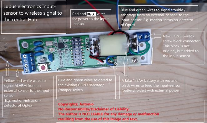 Ich habe vor, einen Optex VXS-RDAM-X5 Außensensor und einen Lupus-Sensoreingang zu kaufen. Die Lupus-Sensoreingang und 3 parallel verbunden AA 3,6 V-Batterien halter (sie foto attachment) in die Optex zu platzieren. Dieser Batterieblock hat dann die gleiche Spannung wie eine 1/2 AA 3,6 V Batterie, die normalerweise in den Lupus-Sensoreingang eingesetzt wird. Ich glaube nicht, dass der Optex-Batteriehalter BH-01 oder RBB-01 zusammen mit dem Lupus-Sensoreingang im Optex XVS-RDAM-(X5) passt. Der Optex wird auf dem Holzschuppen im hinteren Teil des Gartens montiert. Ich kann auch ein Loch in die Holzwand bohren und den Lupus-Sensoreingang und den Batterieblock im Schuppen platzieren und dann verbinden mit dem Optex. Damit folge ich dem Rat von Lupus, dass der Sensoreingang für den Innenbereich ist. Auch der Batteriewechsel ist dan einfach (ohne den Optex zu öffnen!). Die Stromversorgung von Optex und Lupus-Sensoreingang scheint über den Lupus-Sensoreingang zu gehen. Also das schwarz-rote Stromkabel laufen von der Batterie(n) zum Lupus-Sensoreingang batteriehalter und von dort weiter zum Optex. Sie topic: Welche Bewegungsmelder für Außen? Beitrag: #28 PeterF (die foto, 2te attachment) https://www.alarmforum.de/showthread.php?tid=16322 Frage-1: Wird dann im Lupus-Zentrale eine schwache Batterie gemeldet? Also sowohl schwacher Batterie für Optex als auch für Lupus-Sensoreingang? Frage-2: Hat jemand gute oder schlechte Erfahrungen damit, den Lupus-Sensoreingang und den Batteriblock AUSSERHALB des Optex zu platzieren? Frage-3: Passt dass Optex-Batteriehalter BH-01 oder RBB-01 zusammen mit dem Lupus-Sensoreingang im Optex XVS-RDAM-(X5) ODER NICHT? Ich stelle die Frage-1 nicht direkt an PeterF, um die Informationen mit allen zu teilen. Ich hoffe jedoch, dass PeterF auch antwortet! Den Anschluss des Optex an den Lupus Eingangssensor habe ich in einem Bild mit Text dargestellt (Attachment 3, mit englischem Text). Kommentare oder Verbesserungen zum Bild sind auch willkommen. Sie auch meine Rezension/Bewertungen auf Tweakers.net in Fremdsprache NL (aber mit vielen Fotos!): https://tweakers.net/productreview/27043...ngang.html https://tweakers.net/productreview/27044...ogolf.html Bedankt & Groeten, Antonio XT2-plus: LE202/203/204/TX-83, Door-V1/V2, KeypadV2, Temp-s., plug,Osram-plug/bulb,chan-1-relais,Shutter-relaisV2, Motions.V2/V1/360gr/NetworkV3, Outdoor-siren, Line-motion-s.,Dbl-switch, Glasbr.s-V1, Rep-t868-V2, Input-s., Optex-VXS-,Smokedet., Heatdet. |