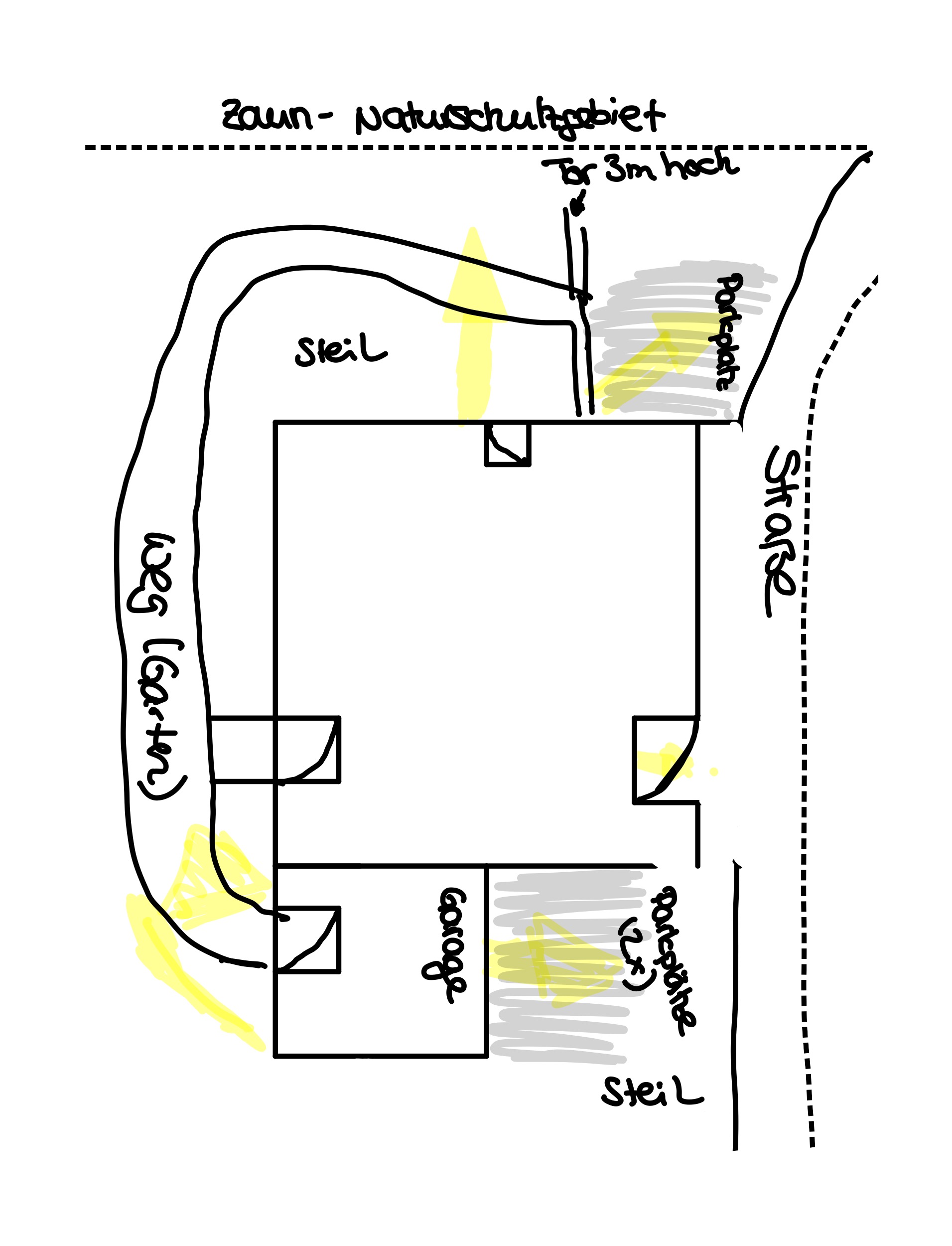 ich bräuchte eine Beratung für eine nach Möglichkeit günstige Kameraüberwachungslösung für ein Grundstück. Anbei eine kleine Skizze mit den zu überwachenden Bereichen (gelb). Das Haus steht an der Grenze zu einem Naturschutzgebiet mit Wald hier wäre ein möglichst großer Winkel der Überwachung sinnvoll. Nach Möglichkeit sollten WLAN Kameras zum Einsatz kommen, da ich ungerne eine Netzwerkverkabelung nach draußen legen möchte. Die übrigen Überwachungspunkte sind lediglich Türbereiche. Im Bereich der Garage und an dessen Hintereingang wäre Netzwerk vorhanden. Zu beachten ist, dass es Kameras mit Personenerkennung sein sollten und diese nach Möglichkeit nicht bei jedem vorbeifahrenden Auto auf der Straße "Alarm" machen. Super wäre wenn die Kamera im Alarmfall eine Push Nachricht aufs Smartphone senden könnte. Und die Aalarmmeldung mittels App verifiziert werden könnte. Zur Speicherung der Medien würde ein lokaler Server mit genügend Speicher zur Verfügung stehen. Hier bräuchte ich allerdings auch noch eine Passende Software Lösung. Ich hoffe ihr könnt mir weiterhelfen. Im Vorfeld bereits besten Dank |