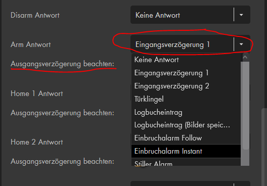 Hier möchte ich, wenn auf Scharf gestellt wird, das nicht gleich der Alarm losgeht, sondern erst mit Zeitverzögerung und in der Zeit kann die Sirene ein leisen Ton abegeben.