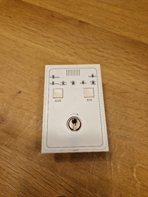 Danke für die schnelle Antwort. Ich hoffe, dass ich die richtige Artikelnr. rausgesucht habe. Es handelt sich um ein Bedienteil mit Schlüsselschalter, ein/aus-Knopf (für Internscharf) und diverse LEDs. Sehen kann man das Teil z. B. hier (wobei der an/aus Knopf fehlt):