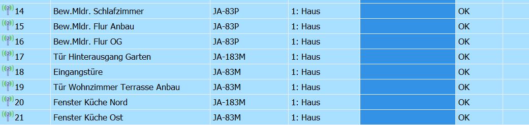 laden dir im ersten Schritte die aktuelle Version. Die heißt jetzt JA-100 Link. Die enthält jetzt eine Diagnose Seite dort kannst Du den Pegel der Batterie in % sehen. Aber denke daran, alle Melder die in der Mitte eine 8 haben, z.B JA-180B übertragen keinen % Wert, oder siehst Du nur OK oder BATTERIE. Bei einer schwachen Batterie, ändert sich die Status Anzeige des Bedienteils auf gelb. Und wenn Du mit der App arbeites wird Dir das als Ereignis angezeigt. Ohne App kannst Du das bei einem JA-154E Bedienteil im Display anzeigen lassen. Dazu musst Du Dich als Admin anmelden. Gruss Tim Ich habe nicht auf jede Frage die passende Antwort, aber zu jeder Antwort die passende Frage. Auch wenn es Wenige ärgert, im Zweifelsfall geht mir Information vor Rechtschreibung. |