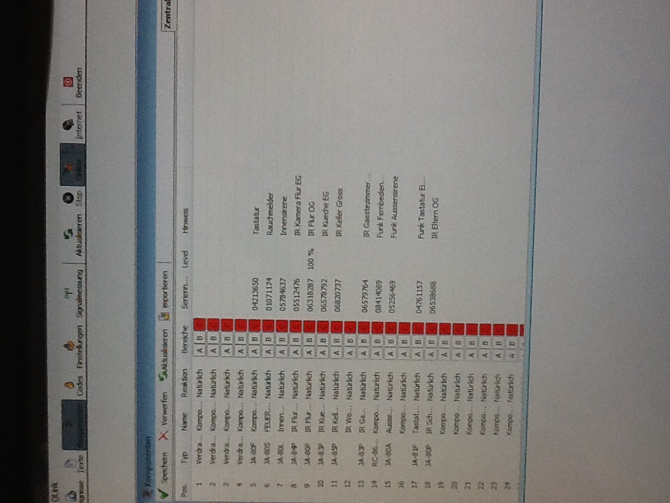 Ok, ich besitze 2 Codes bei meiner Anlage und mehr wollte ich eigentlich auch nicht haben 1. Code zum Scharf/ Unscharf 2. Code Errichter Ich habe keine Cards und möchte auch keine ich habe einen Handsender, der meine Anlage scharf stellt (Knopf Symbol gesperrtes Schloss) oder unscharf (Knopf Symbol geöffnetes Schloss)- den Benutze ich aber gar nicht. Den Handsender musste ich nicht dafür programmieren sondern der macht das einfach. Die 2 rechten Knöpfe (leerer- gefüllter Kreis) sind ohne Funktion. Wenn ich jetzt das Menü >Codes< öffne, dann sehe ich das auf dem Bild. Jetzt versuche ich logisch die Verbindung zu >Komponenten< zu erfassen, gelingt mir aber nicht. Was soll ich jetzt hier eingeben? Achso, ganz wichtig noch die Frage: Sind Tastaturen, Rauchmelder und Sirenen immer C oder muss ich da was beachten? Oder muss ich Tastaturen, Rauchmelder und Sirenen auf A machen, denn sie sollen ja auch bei a noch funktionieren (A bedeutet nur Erdgeschoss bei mir dann, ohne Obergeschoss) Sorry für die vielen Fragen... |