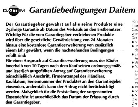 Selbst ein direkter Anruf/Kontakt zu DAITEM brachte Anfangs mehr Verwirrung als Klarheit. Im nach hinein bekam ich dann folgende mail: " ....wir bestätigen den Erhalt Ihrer Daitem Garantiekarte und damit die Verlängerung der Gerätegarantie auf 5 Jahre ab Kaufdatum. Mit freundlichen Grüßen .... " |