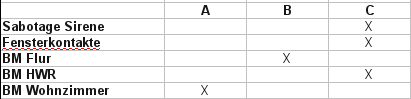 "Geteiltes System: Es kann A oder B scharfgeschaltet werden, sind A oder B scharfgeschaltet, ist auch C scharfgeschaltet." Das verstehe ich dann so, dass egal ob ich A oder B scharf schalte, alle Komponenten die ich C zugeordnet habe immer scharf geschaltet werden. Sollte hier auch wieder ein Übersetzungsfehler sein ? Leider kann ich meine Anforderungen nur mit einem Geteiltem System (so wie ich das verstanden habe) erfüllen. Wenn das nicht funktioniert, warum auch immer, dann wäre das echt sehr unglücklich. |