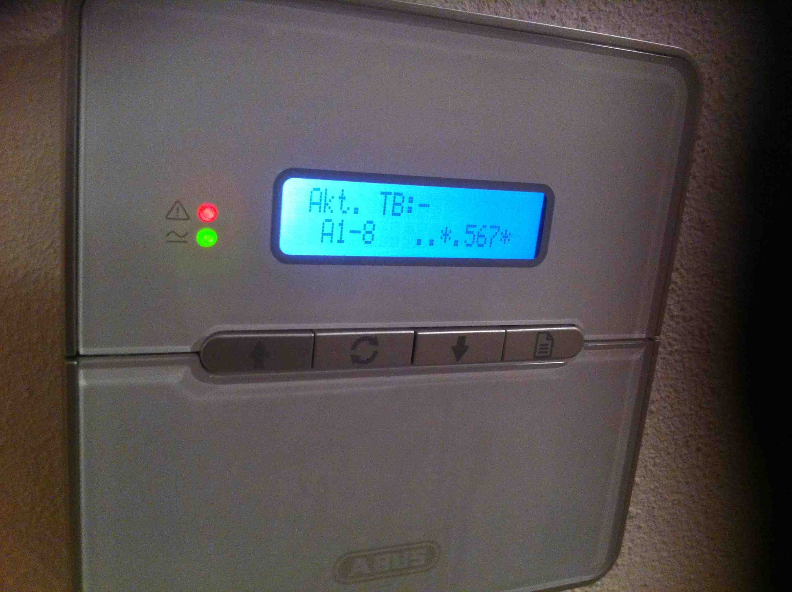 Ich hab von meinem ehemaligen BT420 leider nur ein Bild aus der Bauphase, als es noch eine Ein-Bereich-Anlage war. BT420 Aber die Darstellung einer Mehrbereichsanlage ist auf dem BT420 identisch zum BT800. BT800 Sprich du siehst dann oben die Zahlen 1 bis 8 und darunter den Status (Us = unscharf, Is = intern scharf, Es = extern scharf, Ua = unscharf Alarm, Ia = intern scharf Alarm, Ea = Extern scharf Alarm). Nicht vorhandene Bereiche werden durch Striche angezeigt. |