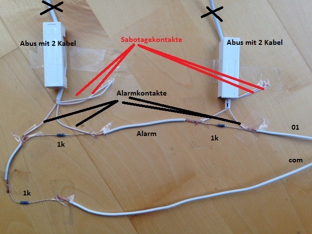 du MUSST die beiden Widerstände in die Meldelinie IMMER einbauen. Dadurch ist es möglich zwischen Alarm (Unterbrechnung des Alarmkontaktes) und Sabotage (Unterbrechung oder Kurzschluss der Leitung) zu unterscheiden......