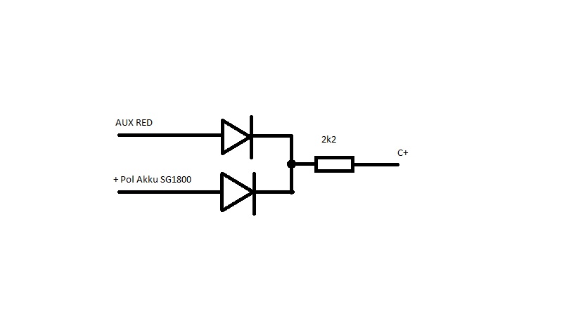 Dann bräuchte man nur dauernd den C- mit einem NC-Kontakt(Öffner) auf 0V zu ziehen und im Alarmfall öffnen. Dh. auch bei Spannungsausfall egal ob Terxon Versorgungsspannung oder SG1800 Akkuspannung würde ja C- immer auf 0v bleiben. Hätte aber den Nachteil, dass im Falle eines Defekts des NC-Kontaktes(zB. korridierter Kontakt) dann doch der Alarm losgehen würde. Damit wäre die Lösung mit den Dioden und dem Widerstand "sicherer", weil da kein Risiko eines Schaltkontaktes noch mitspielt. mfg Sektionschef |