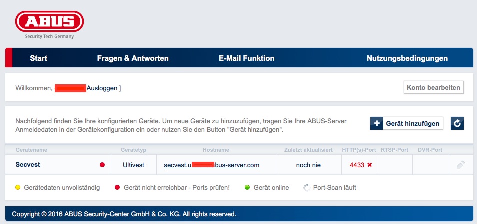 Ich bin grade neu zu Euch hinzugestoßen, habe mich aber zuvor schon Stundenlang durch das Forum gewühlt. Oft schon dachte ich das ich der Lösung durch Eure Beiträge näher komme..... doch leider nichts! Und wie ich auch feststellen musste wohl nicht als einziger. Es scheint mehr Benutzer einer Secvest FUAA50000 zu geben die Probleme mit der Einrichtung des Abus Servers haben als nur ich allein. Immer das rote Licht... nie wird es grün! Kurz zur Erklärung und Hardwarebeschreibung: Im Einsatz ist eine FUAA 50000 ! ( mit Netzwerk verbunden! ) Ein Telekom Speerport W 723 V ( mit welchem die Secvest verbunden ist! ) Eine statische IP wurde vergeben! ( 192.168.2.103 ) -Beim Abus Server einen Account erstellt! -Abus Server Benutzername und Kennwort in Secvest eingetragen. -Portweiterleitung auf Speerport eingerichtet. -Abus Server scant Ports...und scant Ports.... und alles bleibt rot! Leider funktioniert überhaupt nichts... ich bekomme die Secvest nicht online geschalten für einen Fernzugriff via APP! Was ist falsch? Und warum gibt es nicht eine vernünftige Beschreibung von Bus zu diesem Thema mit detaillierten Bildern etc.? Ich hoffe Ihr könnt mir weiter helfen!? PS: Wie kann ich hier meine Screenshots einstellen??? Mit freundlichen Grüßen, Christian. |