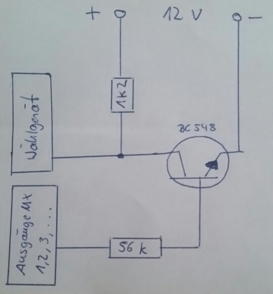 (03-10-2016 12:33)aliasdispi schrieb: [ -> ]An den Kollektor des Transistors kommt ein 1k2 Widerstand und hinter diesen dann die 12V und der Steuereingang des Wählgerätes.