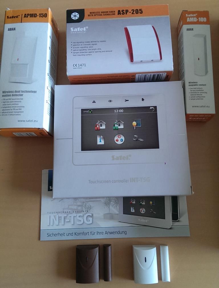 Grundgerät mit Trafo, Akku, ETHM1-Ethernetkarte, 4 Zoll Touchbedienteil in silber, Indoor Funksirene, 1 FunkBewegungsmelder PIR-MW, 2 Mini-Funkmagnetkontakte,