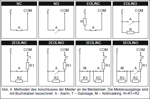 Habe jetzt einen Ausgang des GSM-4 wie beschrieben mit einem Integra-Eingang verbunden, indem ich einen 2,2kOhm Widerstand zwischen Z und COM geklemmt habe und den GSM4-Ausgang mit auf Z geklemmt habe. Als Meldertyp habe ich EOL eingestellt. Läuft wunderbar. (In dem Diagramm unten also die Konfiguration EOL/NO)