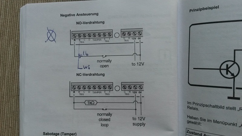 Stattdessen hat sie Transistorausgänge, die entweder offen sind(dann wird über einem pullup Widerstand +12V ausgegeben) oder intern gegen 0V geschlossen werden. Wenn du also einen Transistorausgang mit Anschluß A vom AZWG verbindest, dann schaltet dieser im Alarmfall gegen 0V durch, die zusätzliche Verbindung vom Schaltkontakt zu 0V macht der Transistorausgang intern und wird nicht benötigt.