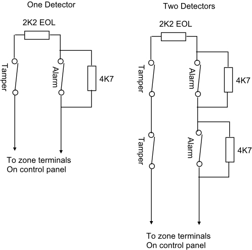 PS: Nicht jede Anlage mag, wie in dem Bild gezeigt, bei mehreren Meldern auch jeweils einen 4k7 Widerstand. Da darf dann nur ein 4k7 über alle Melderkontakte gebrückt ausgeführt sein.