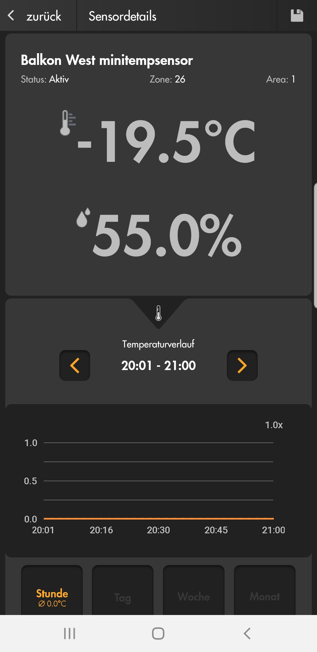ABER in der derzeitigen handy APP werden die Sensordaten zwar korrekt angezeigt, also Temperatur und Luftfeuchtigkeit, ABER hier funktioniert der Verlauf der Temperatur nicht, da diese bei 0°C endet. Auf der PC APP klappt die Anzeige auch im Temperaturverlauf.