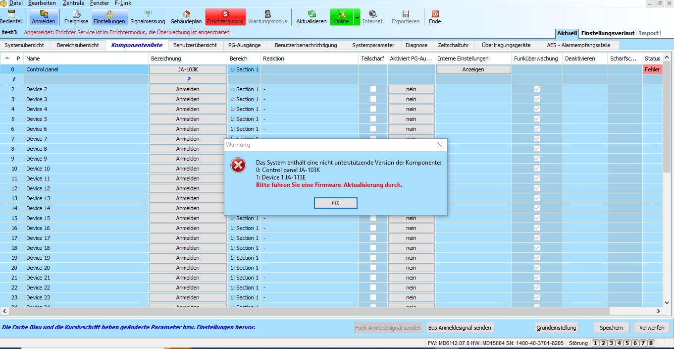 Im nächsten Fenster für das Update taucht das Bedienmodul aber nicht mehr auf. Auch in der Komponentenübersicht steht unter der Bezeichnung ein Fragezeichen. Jemand eine Idee? Beim Verlassen des Errichtermodus wird wieder aufgefordert ein Update zu machen, auch mit der richtigen Bezeichnung des Bedienmoduls.