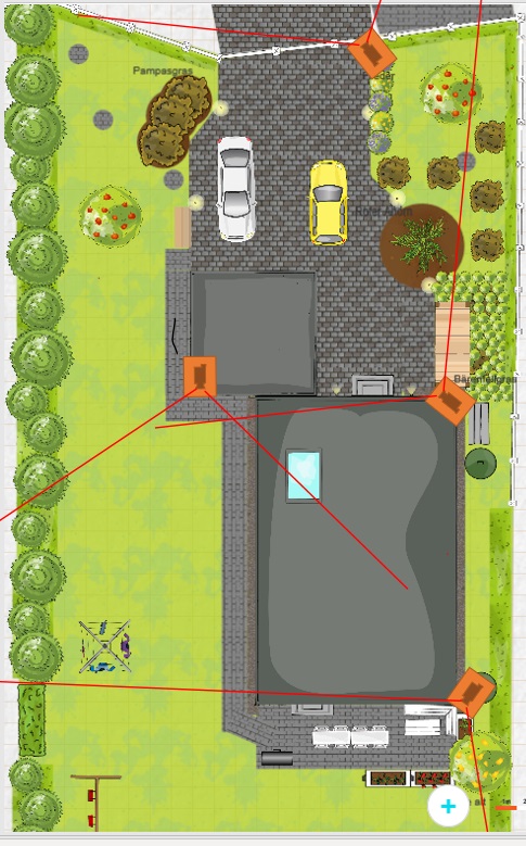 Die Idee ist 3 Kameras mit weitem FOV an Haustüre, Terassentüre und der Garage zu platzieren, sowie eine Videotürklingel am Hoftor (siehe Skizze). Die kompakte Bauart der turret Kameras gefällt mir gut (dezent).