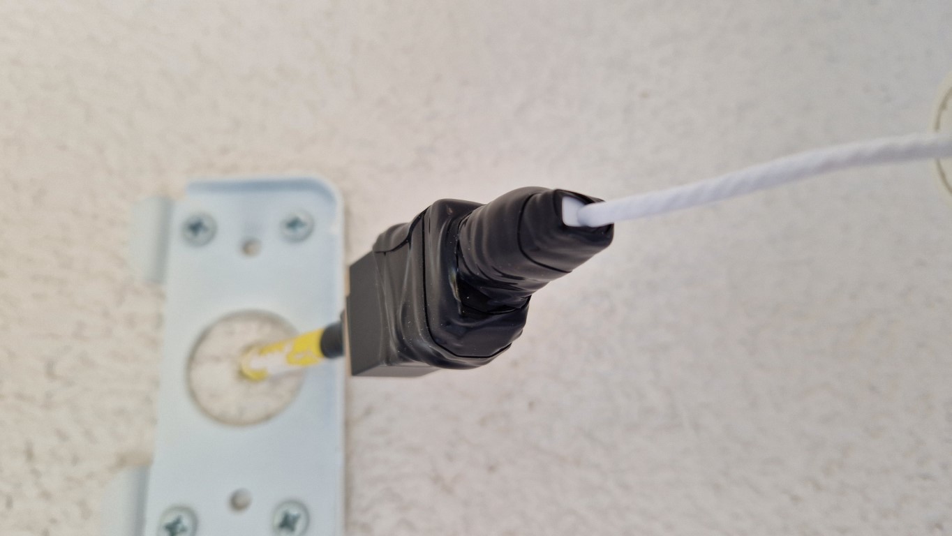 - Hintere Öffnung irgendwie Vergrößern (Feile?), Keystone rein, kurzes Patchkabel dran und aller Verbindungen ggf. mit Isolierband (Danke @peteralarm) umwickeln. Bekommt man das Isolierband notfalls wieder weg?