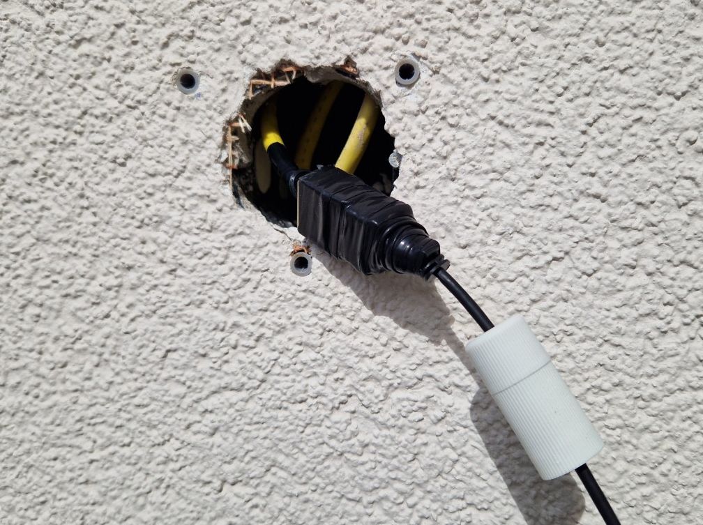 Das Kabel wurde damals in die Stahlbetonwand geritzt und dann nach außen geführt, durch die Dämmung (mit Kaiser Geräteträger)