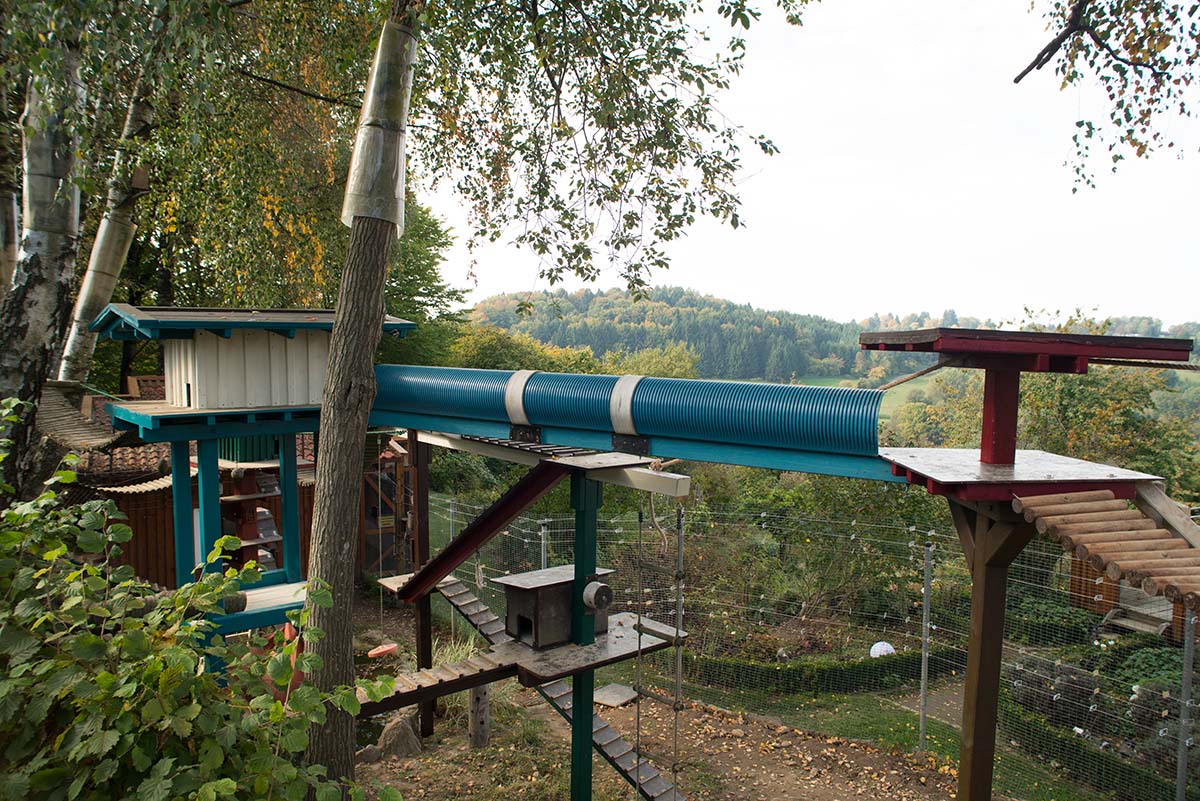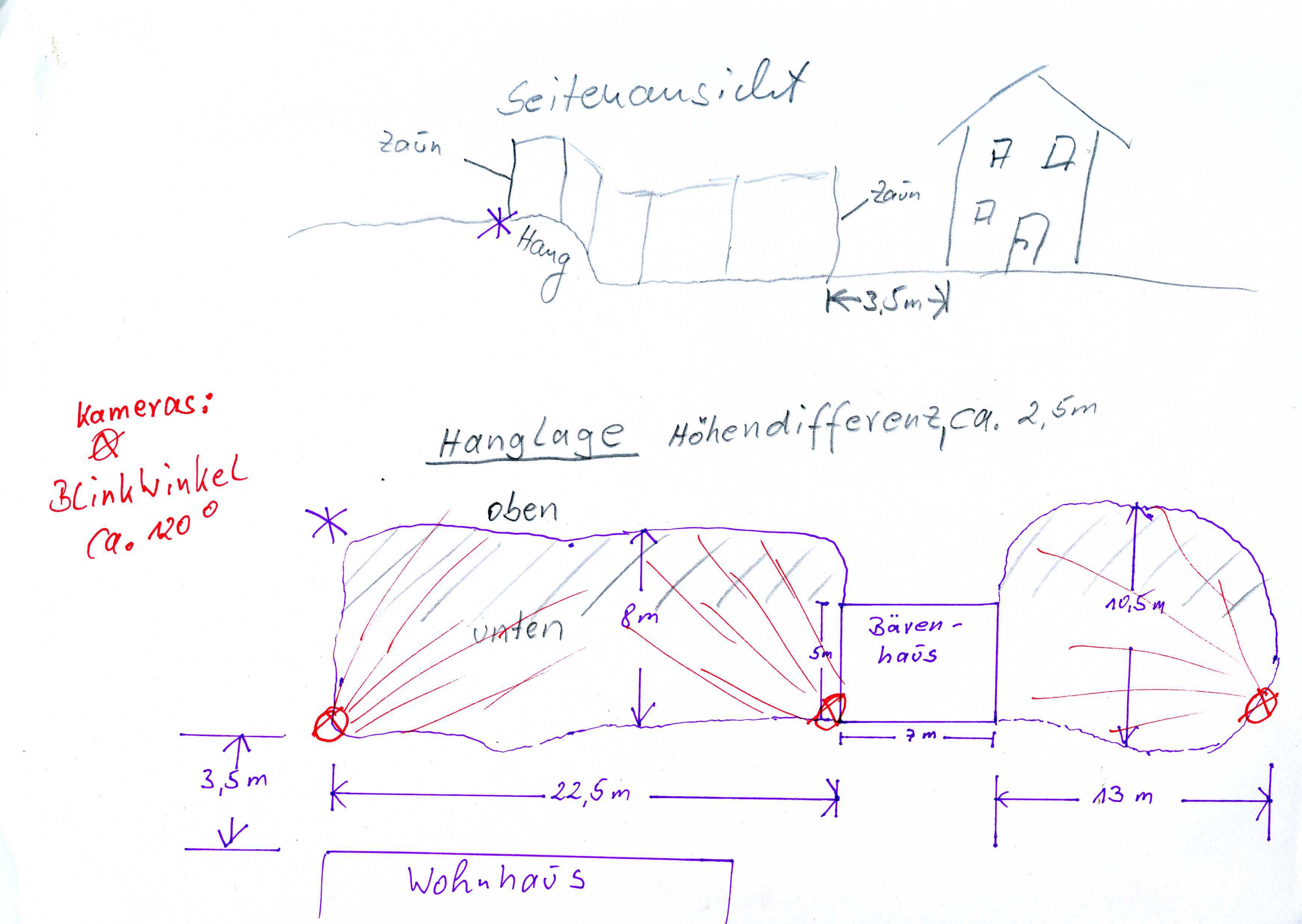 Wir haben weiter überlegt und ich glaube, die 180 Grad teilen wir besser auf zwei Kameras auf, dann wäre das eine Gehege von zwei Seiten einsehbar.