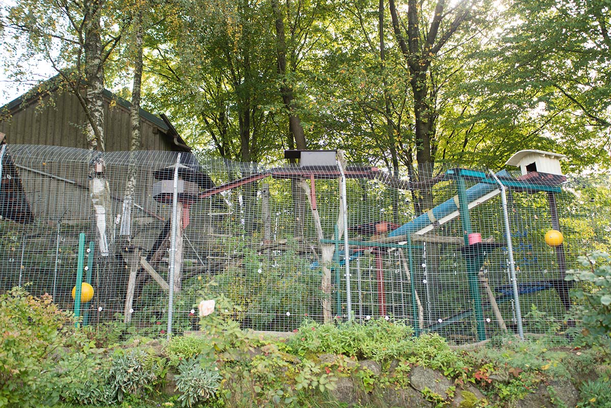 Der Gehegezaun ist 2 - 2,3 m hoch. Innen und auf dem Zaun befindet sich eine Elektroabsicherung.