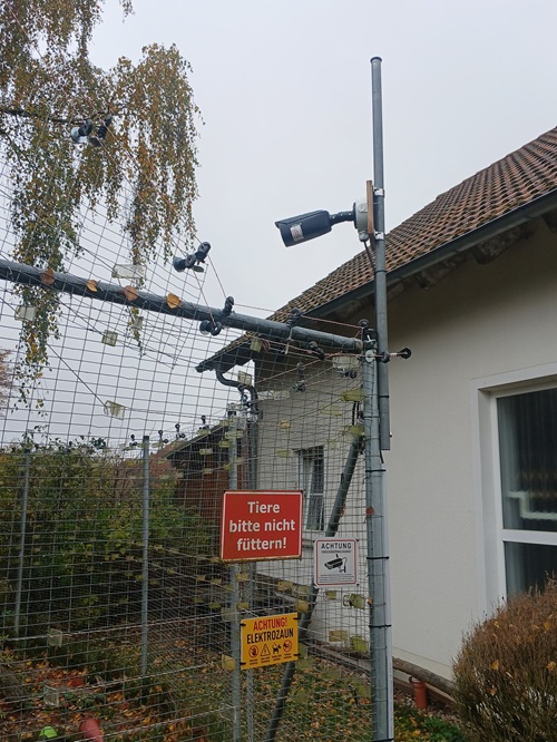 Wir haben heute auf der Leiter "Kamera mit dem Handy" gespielt. Bei der Einstellung Faktor .5 (müssten ca. 110-120 Grad entsprechen) würde das linke Gehege mit 2 Kameras und auch rechts mit 1 Kamera, sehr gut zu sehen sein. Dabei wäre keinerlei Nachbarn zu sehen. Wichtig ist eine gute Nachtsicht. Das alles tiersicher zu installieren, sind wir gewohnt. Kabel und Strom - alles gut absichern. Bei uns kann es etwas kälter werden als im "Tal", und evtl. auch mal mehr Schnee fallen. Also vermutlich die Kameras mit Dach anbringen, damit die Linsen frei bleiben.