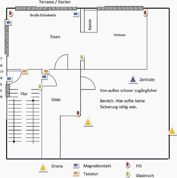 - eine Sicherung des Eingangsbereichs im Souterrain und des Flurs im EG mittels PIR scheidet aus (Mieter, Katze, ...).