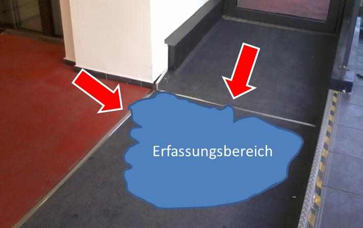 So, leider habe ich keinen vorgebauten Sensor mehr, die wir in den Schächten nutzen. Hier aber mal ein Beispiel, wie wir Wassereintritt-Meldung an einer sensiblen und vielfach begangenen Stelle mittels Edelstahl-Bodenschienen realisiert haben. Die gibt es als Teppichabschlußleisten, sind gewölbt und schaffen damit keine Stolpergefahr. Nur mal so als kleine Idee.