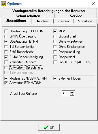Unter Daten-> Otionen -> Übermittlung (Modem ISDN/GSM/ETHM, Externes Modem und Antworten ETHM/GSM) angehakt = Keine Verbindung
