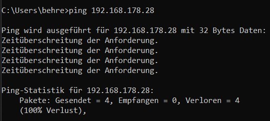 Gehe ich auf 192.168.178.28, also einen höher kommt die Ping meldung mit 100% verlust