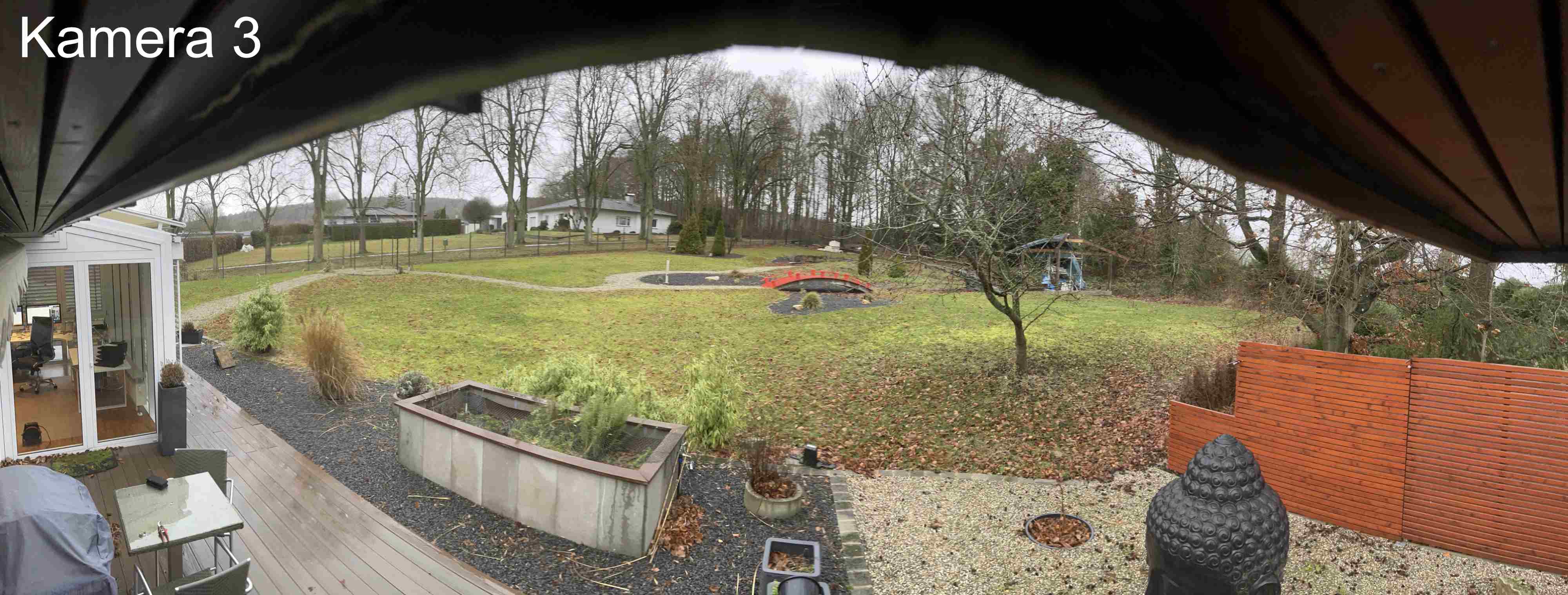 Kamera 3: Blick auf Garten, Erfassungswinkel ca. 180 Grad, Erfassungstiefe > 30 m (bin am Ortsrand und hier fängt dann ein Freigelände an)