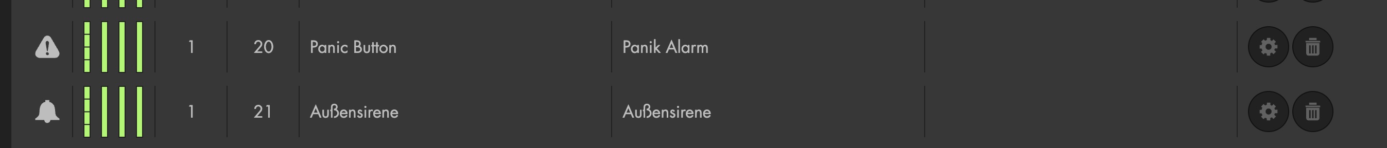 Ich bin jetzt einen kleinen Schritt weiter. Ich habe jetzt im Home-Modus alle Sensoren auf Aus gestellt und dann den Knopf betätigt. Ich sehe, dass sowohl der Panik-Button als auch die Aussensirene auslösen. Allerdings höre ich keinen Ton. D.h. keine Sirene. Auf dem Dashboarg sehe ich, dass der 2. der 4 Balken (von links) für die Aussensirene leuchtet rot. Was bedeutet das und wie kann ich das ggf. beheben. Die Sirene funktioniert, habe ich vorher getestet indem ich den Sabotagealarm ausgelöst habe. Wie ihr erkennen könnt, bin ich ein absoluter Beginner. Bitte entschuldigt, die ggf. naiven Fragen. In der Auflistung aller Sensoren scheint es aber in Ordnung zu sein, siehe Bild. |