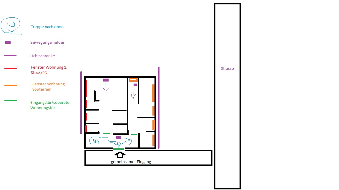 zunächst einmal möchte ich mich für die Rückmeldungen bedanken! Als Privatperson ist es wahrlich nicht leicht sich einen Überblick zum Thema EMAs zu verschaffen. Die polizeiliche Beratung hatte ich schon im Haus. Fenster und Terrasentüren sind mit Pilzkopfbeschlägen verstärkt, eine neue RC3 Haupteingangstür wurde bereits geordert. Ich habe eine Skizze des Grundrisses beigefügt ( besser war es "auf die schnelle" leider nicht möglich, also bitte nicht lachen ).Der ursprüngliche Vorschlag des ersten Errichters sah ja auch die komplette Ausstattung mit Magnetkontakten an den Fenstern und Terrassentüren vor, dahinter als Falle dann Bewegungsmelder. Ich wollte gerne beide Wohnungen über eine Zentrale steuern, mir wurde allerdings von ihm gesagt das wäre nicht möglich...daher 2 getrennt EMAs ![]() Ich hätte gerne eine Art Voralarm bei Herantreten an die jeweiligen Fenterfronten. Deshalb die vermeintliche Lichtschrankeninstallation. Eine komplette Ausstattung aller Fenster wäre dann ja unnötig. Je nach Gesamtkosten schwebt mir nämlich eine gleichzeitige Montage von Kameras an den Lichtschranken vor. Diese könnten dann doch bei Alarmierung einen Fehlalarm ausschließen (Aufschaltung Wachdienst, bzw. Kontrolle des Bildes durch mich). Zumindest stelle ich mir das so vor... Ist das den umsetzbar? Welche Anlage letztlich installiert wird und die o.g. Dinge beherrscht, ist mir letztlich zweitrangig. Nochmal zum Preis: 1. Errichter: komplette Ausstattung aller Fenster mit BM dahinter, 2 Oasis 80 ,Melder, GSM-Geräte usw. für ca. 5000€ (inkl. Monatagepauschale insg. 1600€), allerdings Haupteingangstür in keinster Weise gesichert,alles Funk. 2. Errichter: Telenot,cryptlock, 2 optex Bewegungsmelder für außen, zusätzliche Bewegungsmelder Treppenhaus und in den jeweiligen Wohnungen. KEIN GSM-Gerät, Funk, ca. 7000€ Den ersten Errichter erreiche ich momentan nicht zwecks erneuter Rücksprache wegen meiner Wünsche.... Zu der Arbeitszeit/-lohn: Habe hier irgendwo in einem Thread gelesen, dass die OASIS installation (Funk!) in 4 Stunden erledigt sei (natürlich vom Profi) Der 2. Errichter (Telenot) veranschlagt 36h für seine Installation. Nachvollziehbar? Nächste Woche kommt der letzte Errichter, den ich in meiner Stadt habe. Bin gespannt was der mir so sagen wird... Liebe Grüße und vielen Dank im voraus! Blitz |