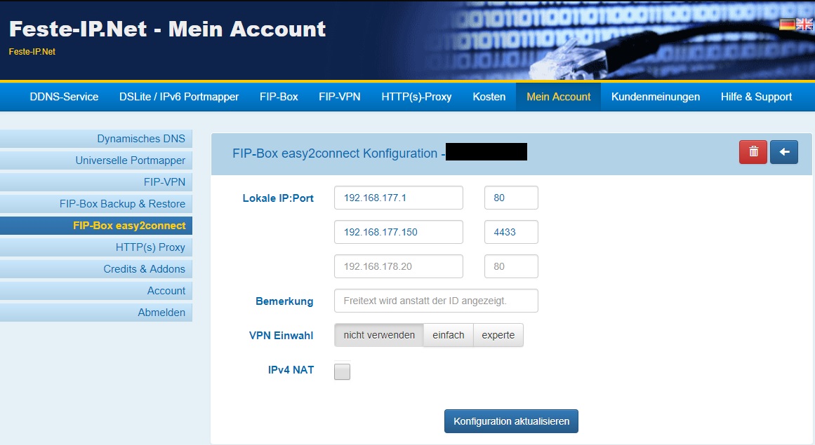 da mir dieses Forum schon ein paar mal gut weitergeholfen hat, möchte auch ich einen Beitrag leisten. Vorwort: ein guter Bekannter möchte in seinem Ferienhaus mit Vodafone LTE Internet (GigaCube) mittels App und Browser auf seine Secvest Alarmanlge zugreifen. Hinweis: die Anleitung gibt meinen Kenntnisstand wieder. Generell empfehle ich aber einen „Profi“ an die Sache ranzulassen. Für die Richtigkeit und volle Funktion übernehme ich keine Haftung! Auch wenn der Beitrag vielleicht als Werbung gesehen werden könnte möchte ich mitteilen, dass ich mit der Firma nichts zu tun habe. Erwähnen möchte ich aber den guten und bezahlbaren Support der Firma Problembeschreibung: diverse Anbieter vergeben bei LTE Verträge keine öffentlichen oder gar feste IP Adressen weshalb der Zugriff von außen nicht möglich ist. Lösung: es gibt Anbieter die Zusatz Geräte/Dienste anbieten. Wie ich das gelöst habe möchte ich euch mit dieser Anleitung zeigen. Was habe ich verwendet / wird benötigt: >>> Fritz Box 6890 LTE >>> FIP Box easy2connect (Feste-IP.net) >>> ausreichende Credits (für ein Jahr kostet es derzeit 20€) >>> einen Account bei Feste-ip.net >>> Portfreigabe Fritz Box >>> konfigurierte Secvest >>> konfigurierten Account bei Feste-IP-net >>> konfigurierte Abus App Einstellungen Fritz Box: Einstellungen Secvest: Einstellungen Feste-IP.net Einstellungen Abus App |