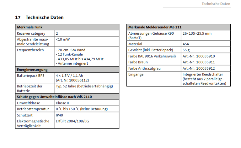 Also Batterielebensdauer von 3 Jahren und mehr kenne ich aus der Praxis bei den Meldersendern auch. Telenot gibt diese auch mit >2 Jahre an. Siehe angefügten Ausschnitt der technischen Beschreibung Telenot MS 211 K90 Viele Fehler sind RTFM Fehler - Read The Fucking Manual Telenot, Daitem, UTC, Hikvision AxPro, Lupus, AVS www.peteralarm.de |