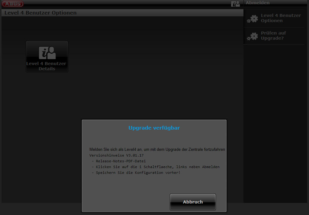 (30-01-2020 22:39)GaRoMeSi schrieb: Hallo, ich bin am Limit beim Upgrade auf die v3.01.17. Ich habe eine FUAA50600 auf dem letzten SW Stand v3.01.14 und möchte den neusten Update aufspielen. ...ich hatte das selbe Problem. Der Fehler war, dass man sowohl im Benutzermenü Level4-Updates freigeben muss -- wobei als Benutzer ADMIN gemeint ist und kein "normaler Benutzer". Das hätten die Kollegen von ABUS in der Installationsanleitung und ihren Workarounds echt klar schreiben können, hätte auch mir viel Zeit erspart! Ansonsten wundert man sich, warum man nur das Hinweisfenster und nicht das Uprade-Button bekommt...