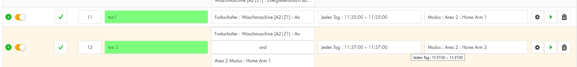 (10-06-2020 11:07)pamp schrieb:(09-06-2020 13:46)shortyHonk schrieb: Mit den 4 Schritten möchtest du dann praktisch die 4 Tage prüfen und erst bei dem letzten TRUE Ergebnis dann umschalten, richtig? Ich habe es gerade mit einer Testregel probiert. Deine Vermutung stimmt, die Regeln werden nacheinander durchgerattert. Die Lupus suggeriert zwar durch die Anzeige der Millisekunden das die Regeln genau ausgeführt werden, aber die Toleranz liegt in der Realität wahrscheinlich im Bereich von 1 Minute. Aber das würde sich mE lösen lassen, wenn man die Regeln einfach ein paar Minuten zeitversetzt laufen lässt, sprich nicht alle um 15:00 Uhr, sondern 15:05, 15:10, 15:15. |