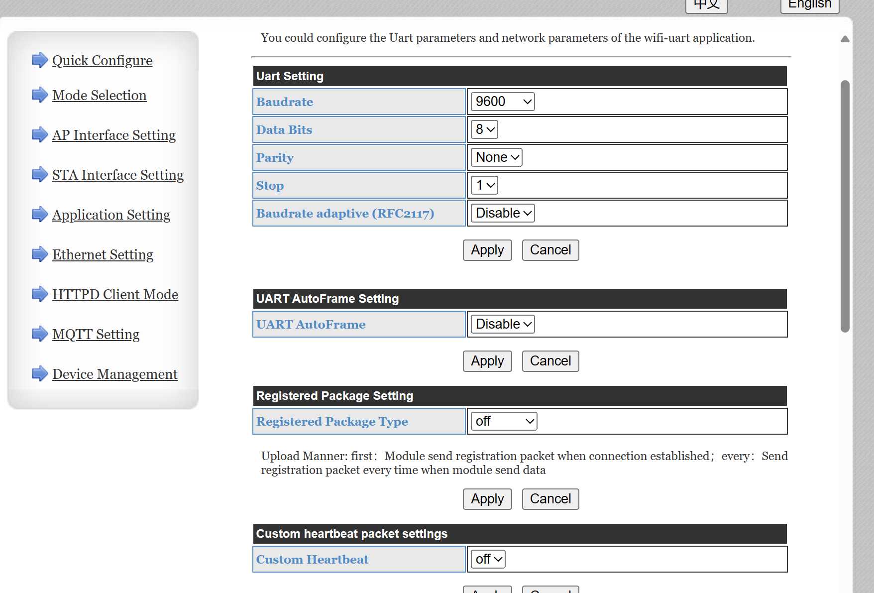 gesagt getan (siehe Anhang). Auch hier bekomme ich meine "xyz" Message zurück. Wenn ich sende kommt "no" zurück und die die Verbindung wird abgebrochen. Sehr unhöflich ;-) Die JA-121T wurde von meinem Alarmanlagen-Profi über Fernwartung installiert. Er hat diese jedoch noch nie implementiert, welche Parameter dort noch notwendig sind entzieht sich meiner Kenntnis. Könntest Du bitte mal über Wifi-Uart Settings d'rüberschauen (siehe Anhang), vielleicht stimmt dort was nicht. Mit "try and error" bin ich nicht weiter gekommen... Als DataTransfer Mode habe ich "transparent mode" eingestellt. LG Peter |