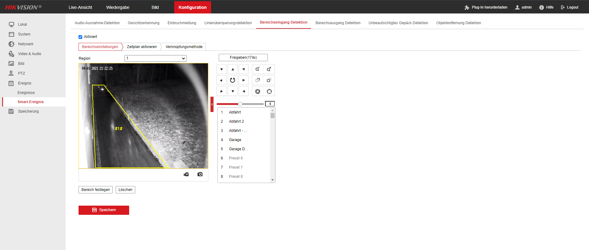 Ich bin momentan am verzweifeln mit meinen Hikvision PTZ Kameras. Ich habe das Smart-Ereignis: Bereichseingangs Detektion eingeschalten und seit dem nimmt es immer die Reflektion der vorbeifahrenden Autos auf. In der Anleitung steht, dass man die Empfindlichkeit der definierten Bereiche einstellen kann. Diese Einstellung steht bei mir leider nirgends (Screenshot). Ich habe fast alles versucht. Kamera habe ich schon zurückgesetzt. Gebracht hat es nicht viel. Ich hoffe jemand von euch kennt dieses Problem und weis wie es zu beheben ist. Ich danke schon mal für eure Antworten. |