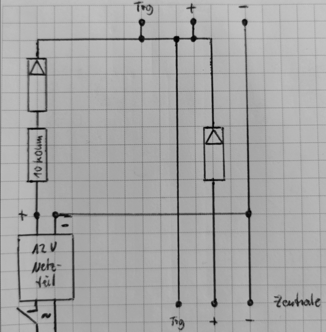 Momentan ist es nicht so einfach Zeit zu finden. Ich habe mir einen Bypass gebaut (für Wartungszwecke und Tests). Der 12 Volt Eingang der Zentrale ist durch eine Sperrdiode geschützt und es ist ein zusätzliches 12V Netzteil mit einem Schalter angeschlossen. Damit sollte bezweckt werden, dass die Stromversorgung der Sirene bei ausgeschtetem Zentrale aufrecht erhalten bleibt. Zusätzlich habe ich zwischen die Trg Leitung zur Sirene auch eine Sperrdiode geschaltet und auch da den Bypass aufgelegt. Ziel hier war es, die 12V zur Sirene auf der Alarm Leitung aufrechtzuerhalten und so quasi im Alarm Fall die Sirene zu überbrücken. Dies ist zum Testen, einstellen und Warten. Jetzt habe ich das Phänomen, dass durch die Diode die Trg Leitung nicht auf 0 geht sondern irgendwie bei 3V bleibt und somit die Sirene nicht auslöst. Nehme ich die Diode wieder raus geht auch die Sirene wieder an. Ich will ja aber durch die diode verhindern, dass die 12V des Netzteile zur Steuerplatine der Zentrale gelangen. Die sollen ja nur zur Sirene. Wodurch entsteht dieser Effekt und wie kann Ich dies umgehen? Benötige ich eventuell diese Diode nicht (glaub ich zwar nicht, aber frage ich hier mal)? Danke schonmal für weitere Tipps. LG, Robert |
