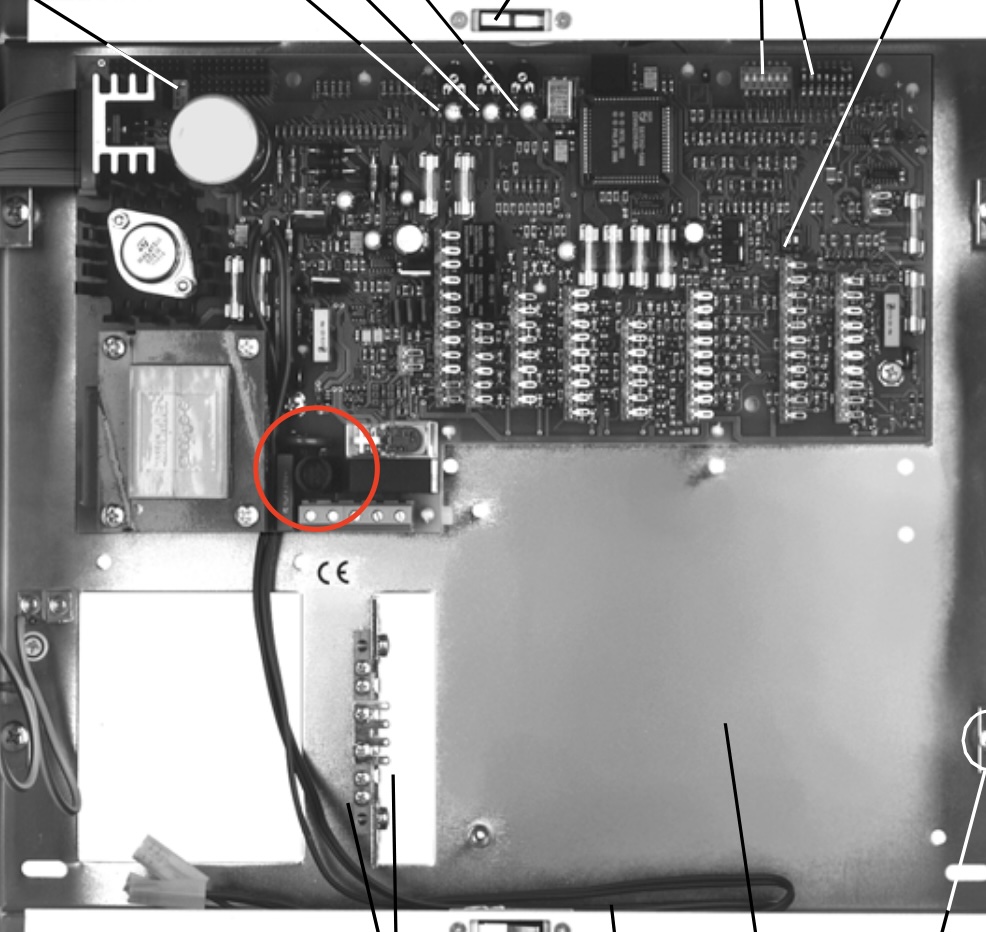 Auf dem Bild ist die Position der Sicherung eingetragen. Mit einem Schlitzschraubendreher den Halter leicht reindrücken, drehen, dann kannst du diesen herausziehen und legst ihn einfach unten auf dem Boden der Zentrale ab. |