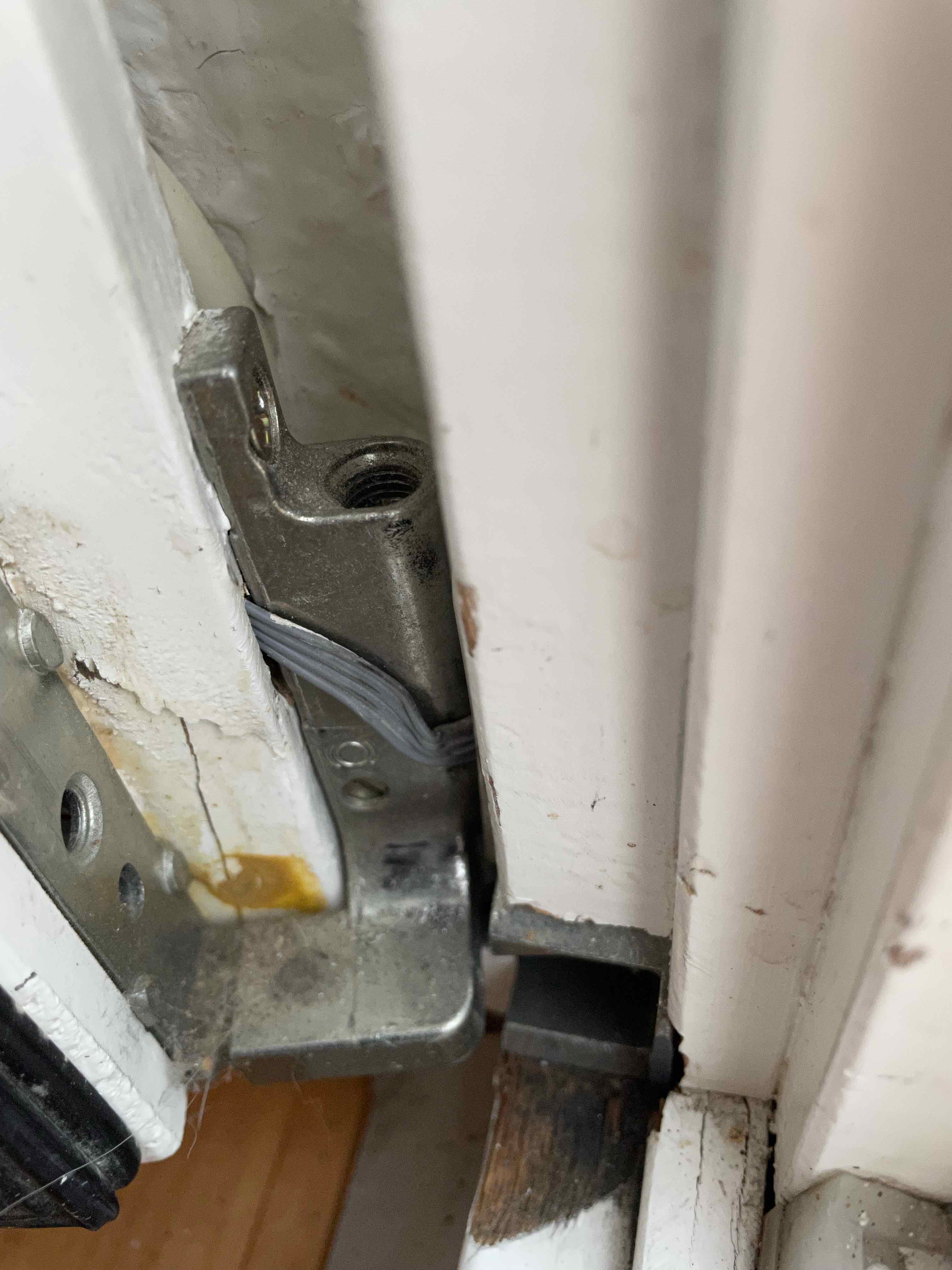 Wenn man das Foto (Kabelübergang vom geöffneten Fenster im Bereich des Ecklagers) vergrößert, sieht das Kabel - und zwar die obere Ader - nicht mehr so toll aus