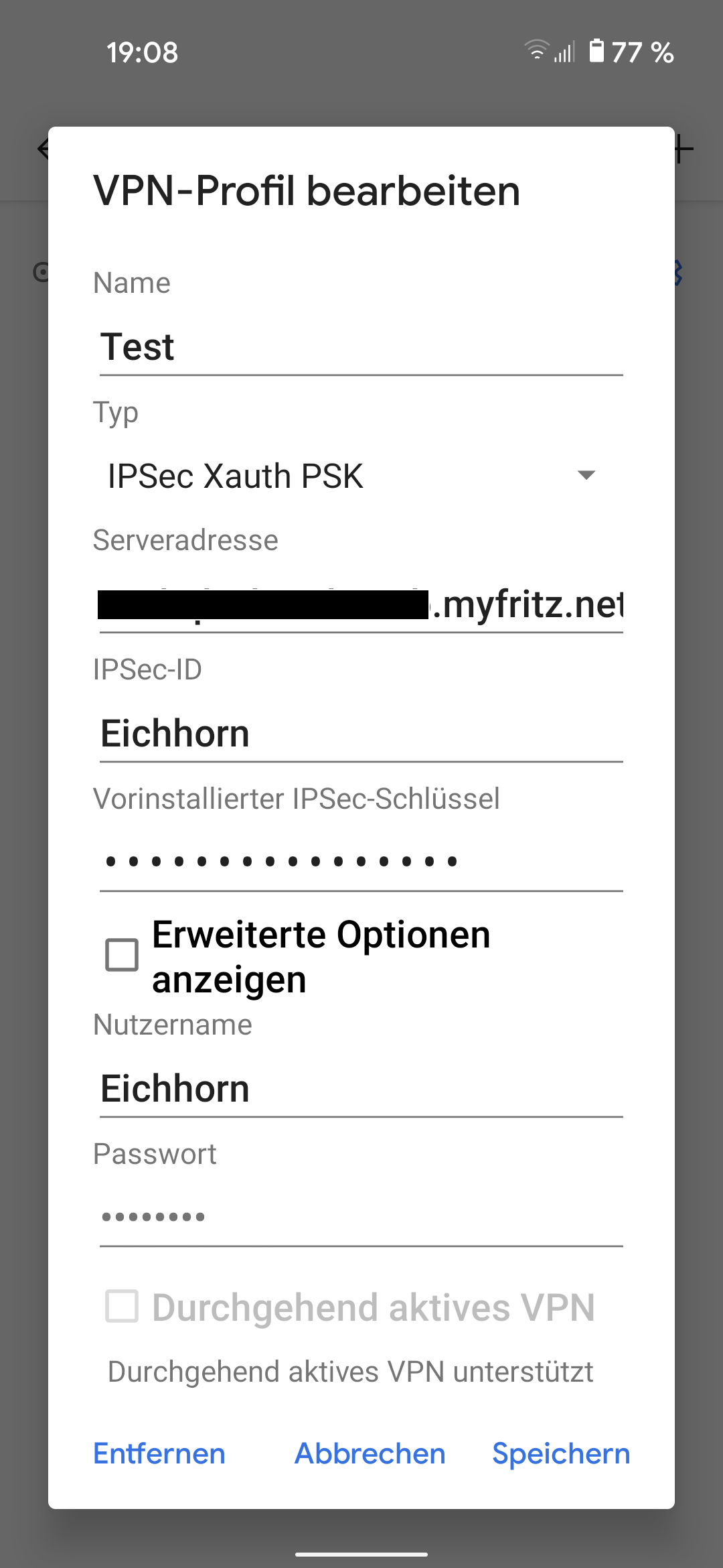 Also, 1. habe neu gestartet, heute sogar Stecker komplett raus gezogen 2. ist nicht eingerichtet 3. ich habe nur eine Fritz!Box, der Absatz "VPN-Verbindungen zwischen der FRITZ!Box und anderen Netzwerken" ist leer 4. Ich habe kein Programm "FRITZ!Box-Fernzugang" installiert, habe aber ein MyFritz Konto angelegt und diese Adressen dgsdgdfgrt.myfritz.net (ist gerade wahllos von mir getippt also keine richtige Adresse!) in der VPN Verbindung am Smartphone benutzt. Heute früh war es so, ohne Veränderung der Einstellungen! FB zum Neustart Stecker gezogen. War mit dem Smartphone noch im heimischen WLAN. VPN Verbindung hergestellt und auch wieder unterbrochen. Klappte alles mehrmals super. Danach WLAN getrennt und mit dem mobilen Internet verbunden. VPN Verbindungsaufbau probiert: keine Verbindung möglich. Mehrmals probiert, ging nicht. Wieder mit dem WLAN verbunden, auch jetzt keine Verbindung mehr möglich???? Ich bin ratlos! Dadurch das es ja anfangs geklappt hat, müssten die Einstellungen doch richtig sein. Und war die in der My!Fritz App weg gefallene "Heimnetzverbindung" nicht auch eine Art VPN? Da klappte ja alles noch wunderbar. LG Eichhorn |