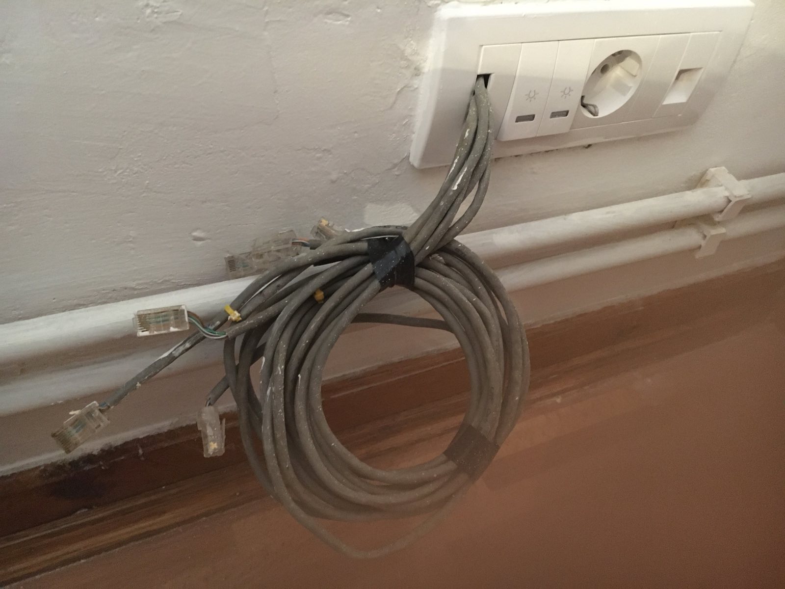 Das sieht für mich wie eine analog Verkabelung aus, die auf RJ11 Stecker gecrimpt wurden. Habe sowas noch nie gesehen. Um da Klarheit zu schaffen, passt ein Stecker in einen Netzwerkport?